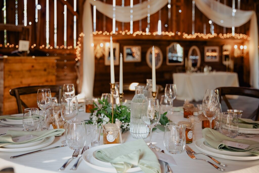 From the very first glance, guests were welcomed into the most romantic setting. The bridesmaids glowed in flowing green dresses that beautifully complemented the natural surroundings and floral decor. It featured white blooms with lush greenery, creating a timeless and serene aesthetic that brought the entire barn to life.